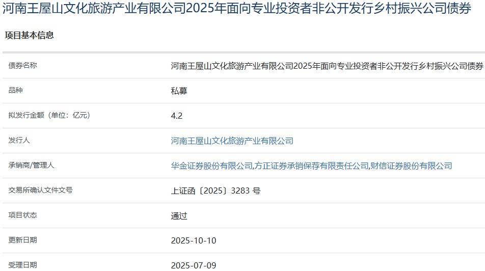 【大河财立方消息】10月11日,河南王屋山文化旅游产业有限公司2025年面向专业投资者非公开发行乡村振兴公司债券项目获上交所通过。