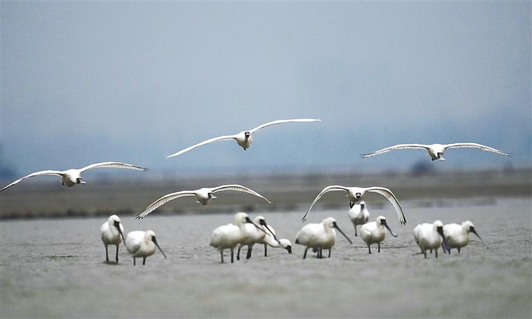 11月18日,在儋州市儋州湾湿地滩涂上,一群有着“鸟中大熊猫”之称的黑脸琵鹭正悠闲栖息、觅食。目前,随着北方气温下降,大批候鸟陆续飞抵儋州湾安家越冬。